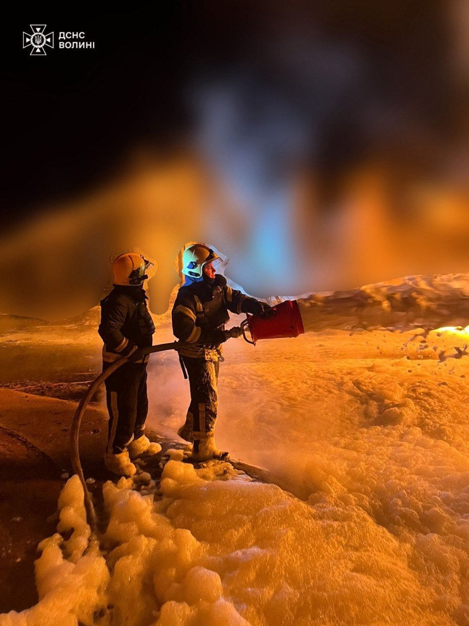 Після нічної масованої атаки російськими дронами на Волинь надзвичайники ліквідували пожежі, що спалахнули на об’єктах критичної інфраструктури