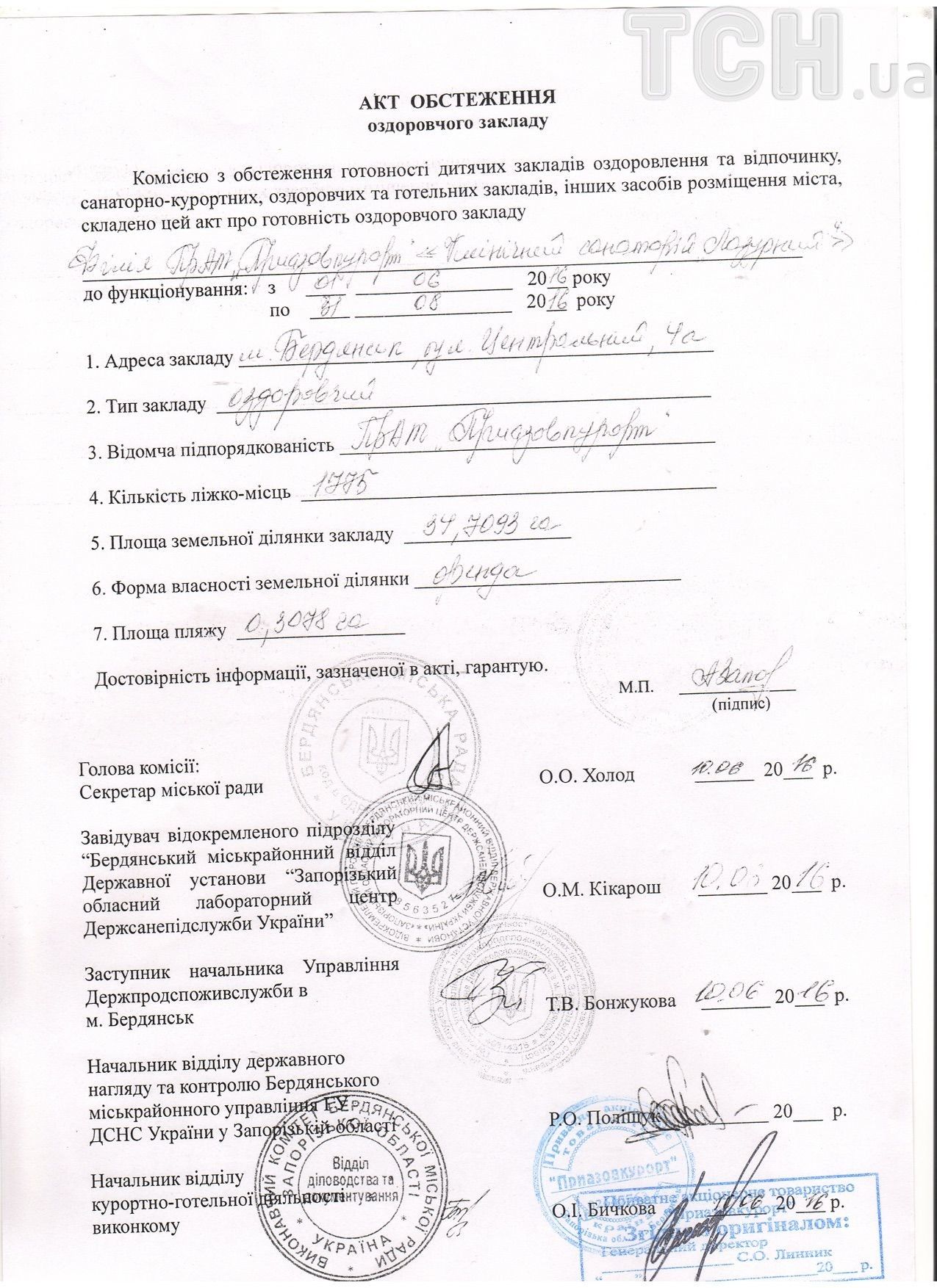 У документації до тендеру прикріплений акт санітарно-епідеміологічного обстеження об'єкта, але за вересень 2016 року. Хоча, в міськраді Бердянська запевнили, що санаторій проходив п'ять перевірок і всі вони протягом останніх трьох місяців були провалені.