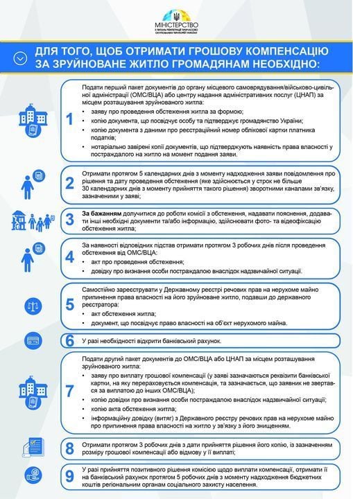 Так, для того, щоб отримати компенсацію за зруйноване житло на Сході України внаслідок збройної агресії Росії, потрібно здійснити 9 кроків: