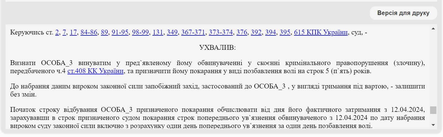 Суд проаналізував матеріали справи та визнав чоловіка винним за ч. 4 ст. 408 КК України і засудив до 5 років позбавлення волі.