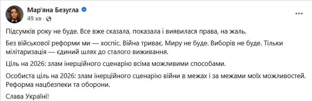 «Ціль на 2026: злам інерційного сценарію всіма можливими способами. Особиста ціль на 2026: злам інерційного сценарію війни в межах і за межами моїх можливостей. Реформа нацбезпеки та оборони», — таку мету поставила собі Безугла на новий рік.