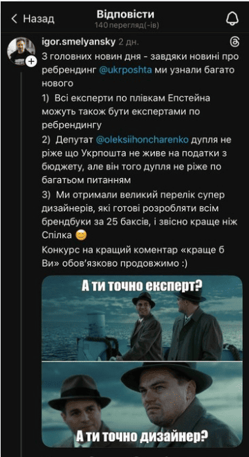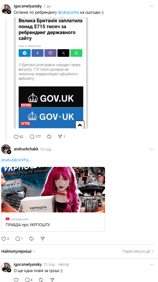 У соцмережах спалахнув скандал навколо ребрендингу «Укрпошти», на який, за даними компанії, витратили близько 600 тисяч гривень. Після хвилі критики генеральний директор підприємства Ігор Смілянський почав публічно відповідати користувачам, використовуючи різкі та образливі формулювання.
