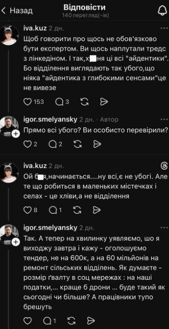У коментарях до допису Смілянського блогерка Іванна Кузьма заявила, що стан відділень «Укрпошти» не врятує «айдентика з глибокими змістами».