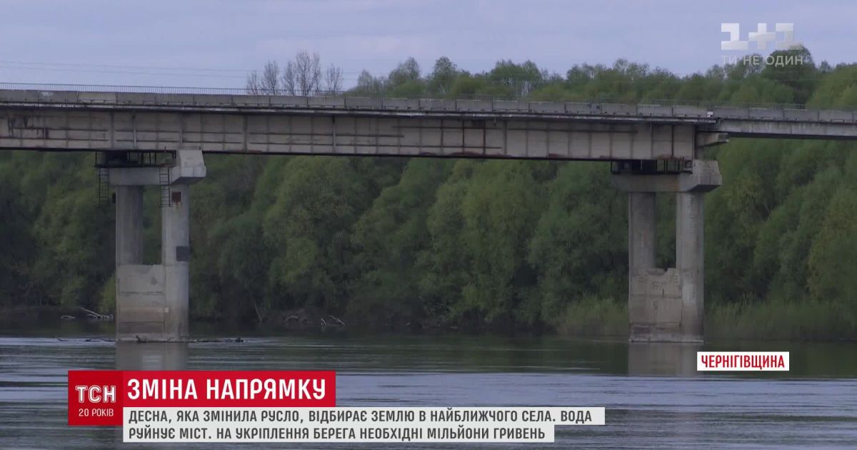 Через зміну русла Десни на Чернігівщині може впасти автомобільний міст. Течія підмиває опори і палі, а сама річка щороку забирає по 10-12 метрів берега, йдеться у сюжеті ТСН.16:45.