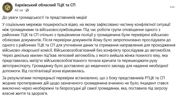Харківський обласний ТЦК прокоментував скандал у Мережі, де жінка кидалася на бус ТЦК, у якому перебував її мобілізований син.