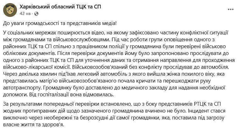 «Проте через декілька хвилин під’їхав легковий автомобіль, з якого вийшла жінка похилого віку, яка представилася матір’ю військовозобов’язаного, почала кричати і перешкоджати руху автотранспорту. Громадянку було доправлено до медичного закладу для надання необхідної допомоги. Від госпіталізації вона відмовилася», — йдеться у повідомленні.