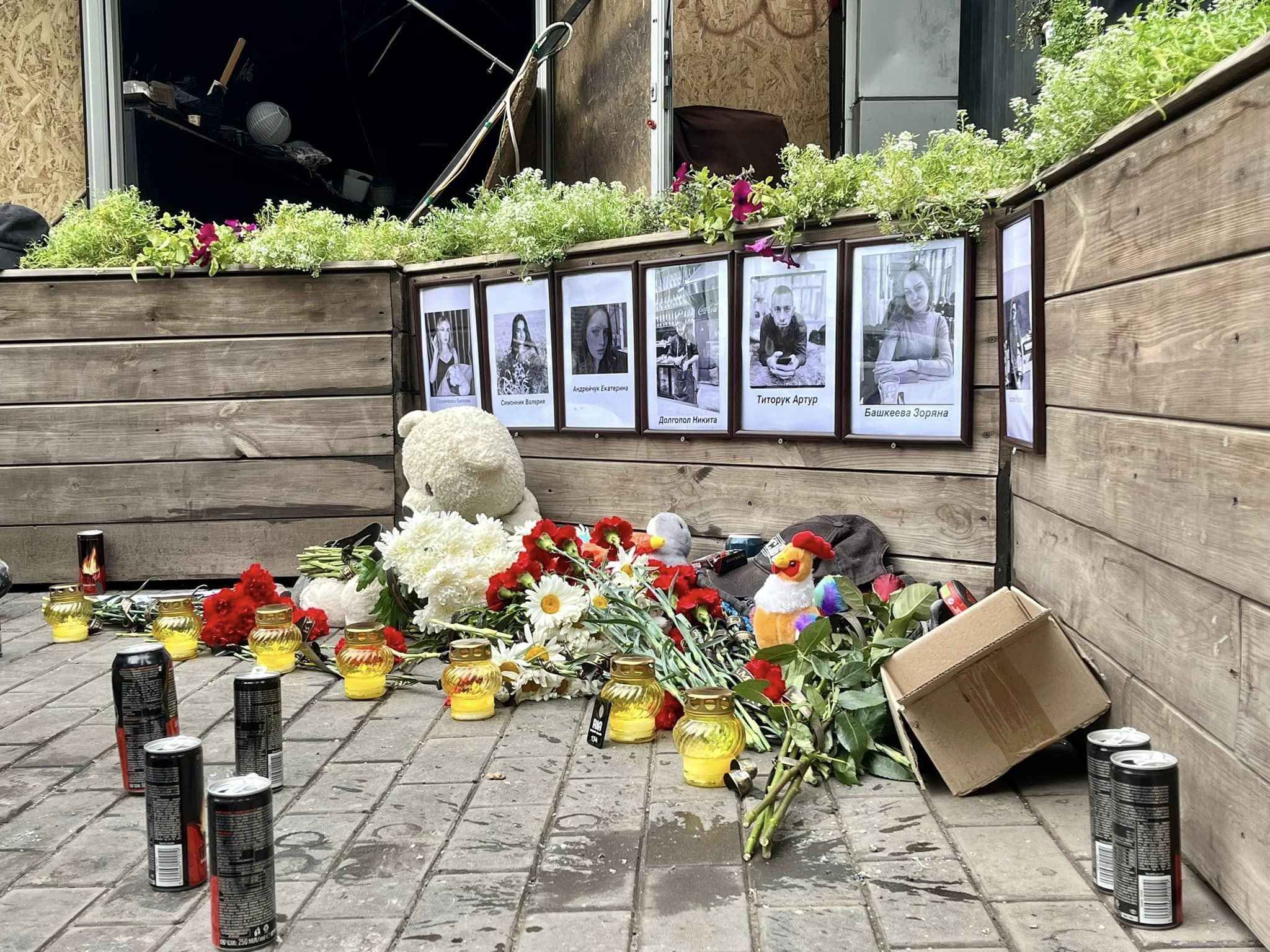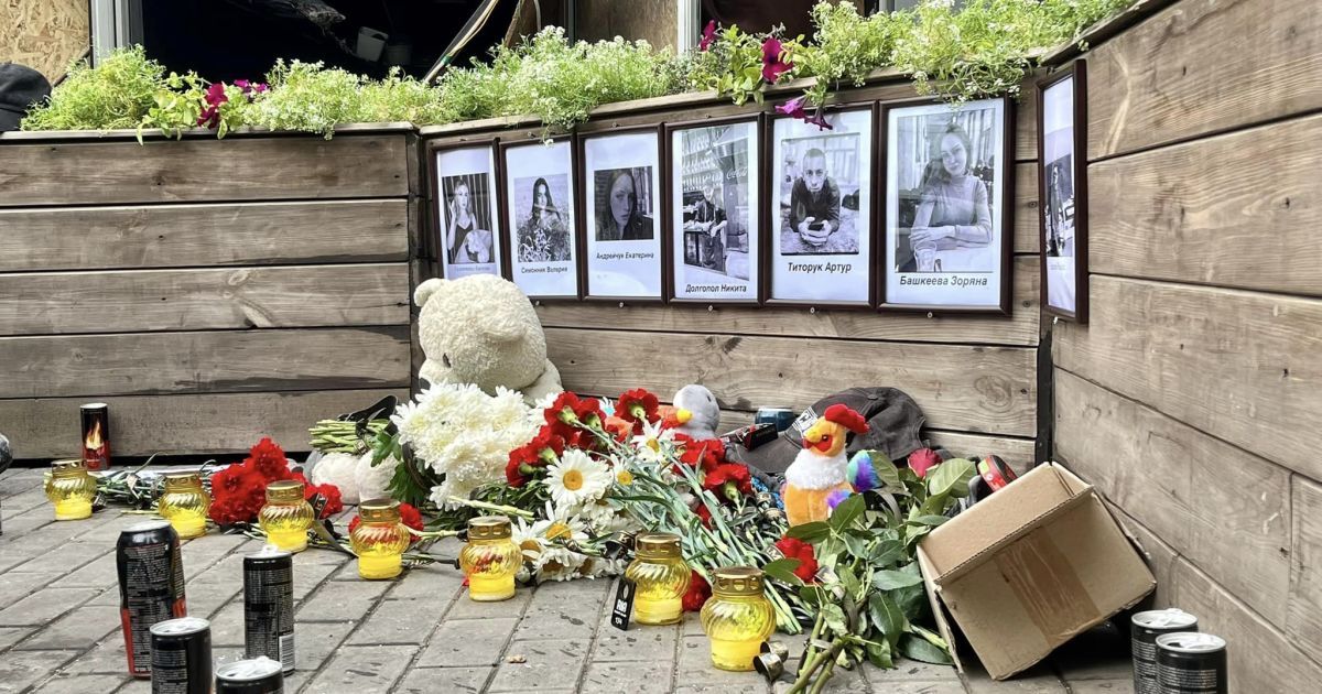 Під чорно-білими світлинами молодих людей, четверо з яких — жінки, з’явилася велика кількість квітів та м’яких іграшок, тут також запалені лампадки.