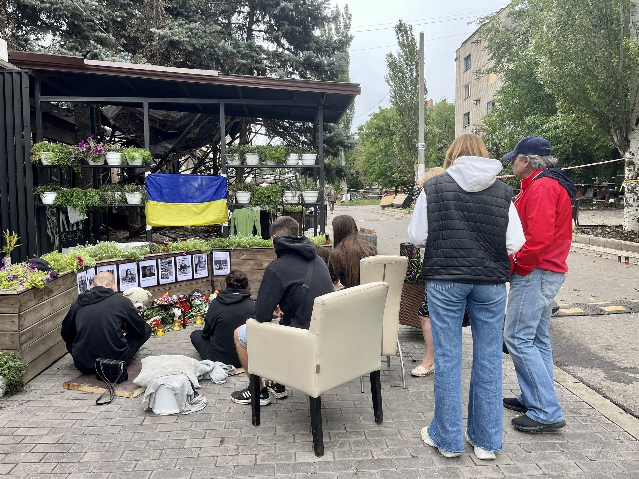У місті Краматорську на Донеччині біля ресторану “Ріа”, в який влучила російська ракета 27 червня, облаштували місце вшанування пам'яті загиблих. До імпровізованого меморіалу люди приносять живі квіти та іграшки.