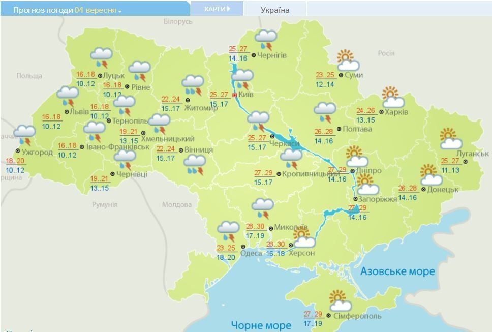 Захід. На Закарпатті вдень 18-20 градусів тепла, на Волині, у Львівській, Івано-Франківській і Рівненській областях - 16-18. Вночі в цих регіонах - 10-12.