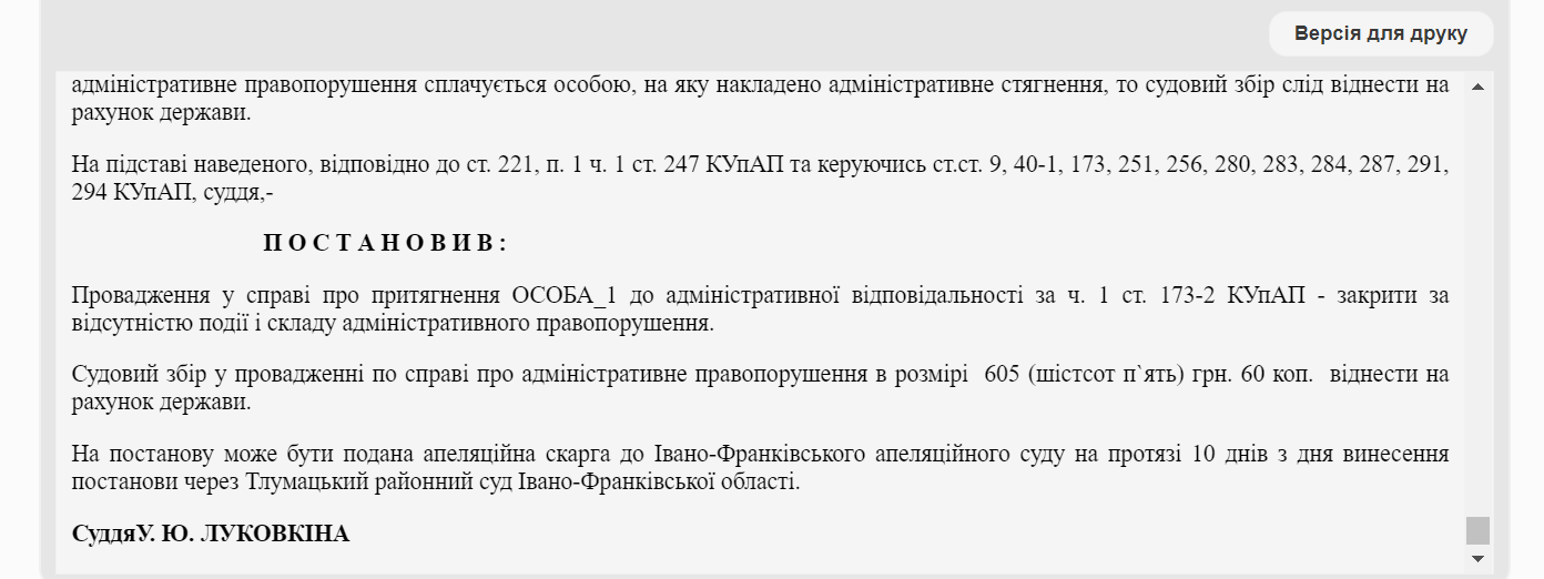 "Таким чином вважаю, що по цій справі про адміністративне правопорушення не доведено поза всяким розумним сумнівом факт вчинення матір'ю домашнього насильства, а тому суд приходить до висновку про відсутність в її діях події і складу цього адміністративного правопорушення, що є підставою для закриття провадження у справі на підставі п. 1 ч. 1 ст. 247 КУпАП", - йдеться у поясненні суду.