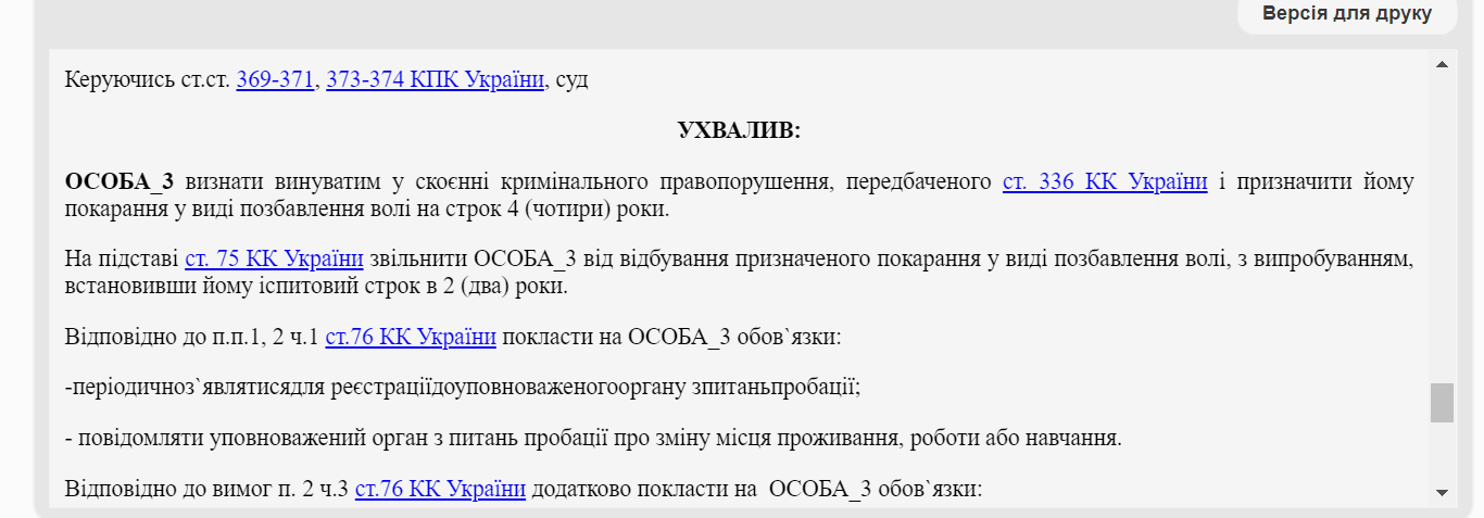 Суд проаналізував матеріали справи та визнав чоловіка винним за ст. 336 КК України та засудив до 4 років позбавлення волі, замінивши реальний термін на 2 роки іспитового.