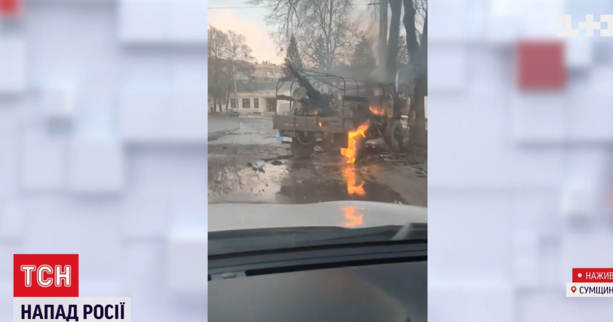 Перед цим росіяни обстріляли війьскову частину у самих Сумах, наші військові вступили у бій, але троє бійців загинули і шестеро поранені. В Охтирці росіяни також розбили військову частину. У лікарні перебуває 30 поранених людей, зокрема двоє росіян. За останніми даними - Охтирка під контролем України. Журналістка підтвердила, що адмінбудівлі - під нашим контролем, але у місті багато ворожої техніки.