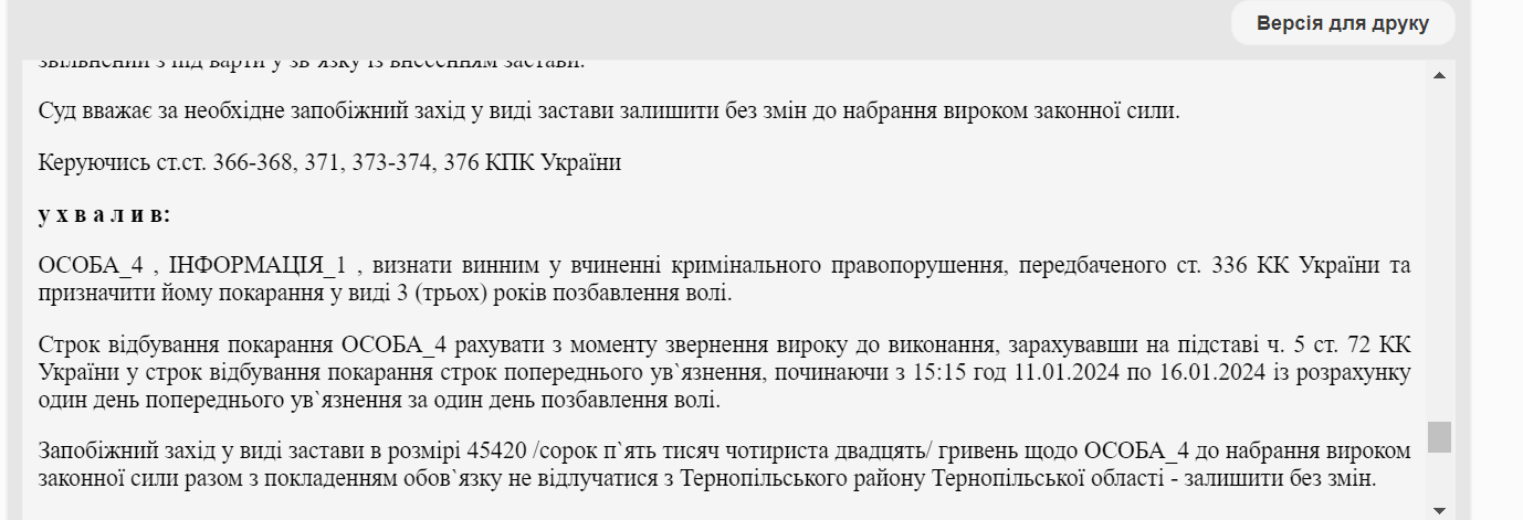 Про це йдеться у вироку Козівського районного суду Тернопільської області.