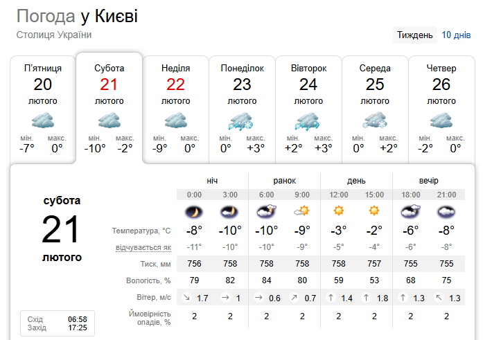 Температура повітря у столиці 21 лютого коливатиметься від -10 до -2 градусів.