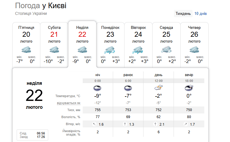 У неділю, 22 лютого, нічні морози навіть посиляться — місцями до -17, але вдень почнеться поступове потепління і стовпчики термометрів покажуть від -3 до +2 градусів.