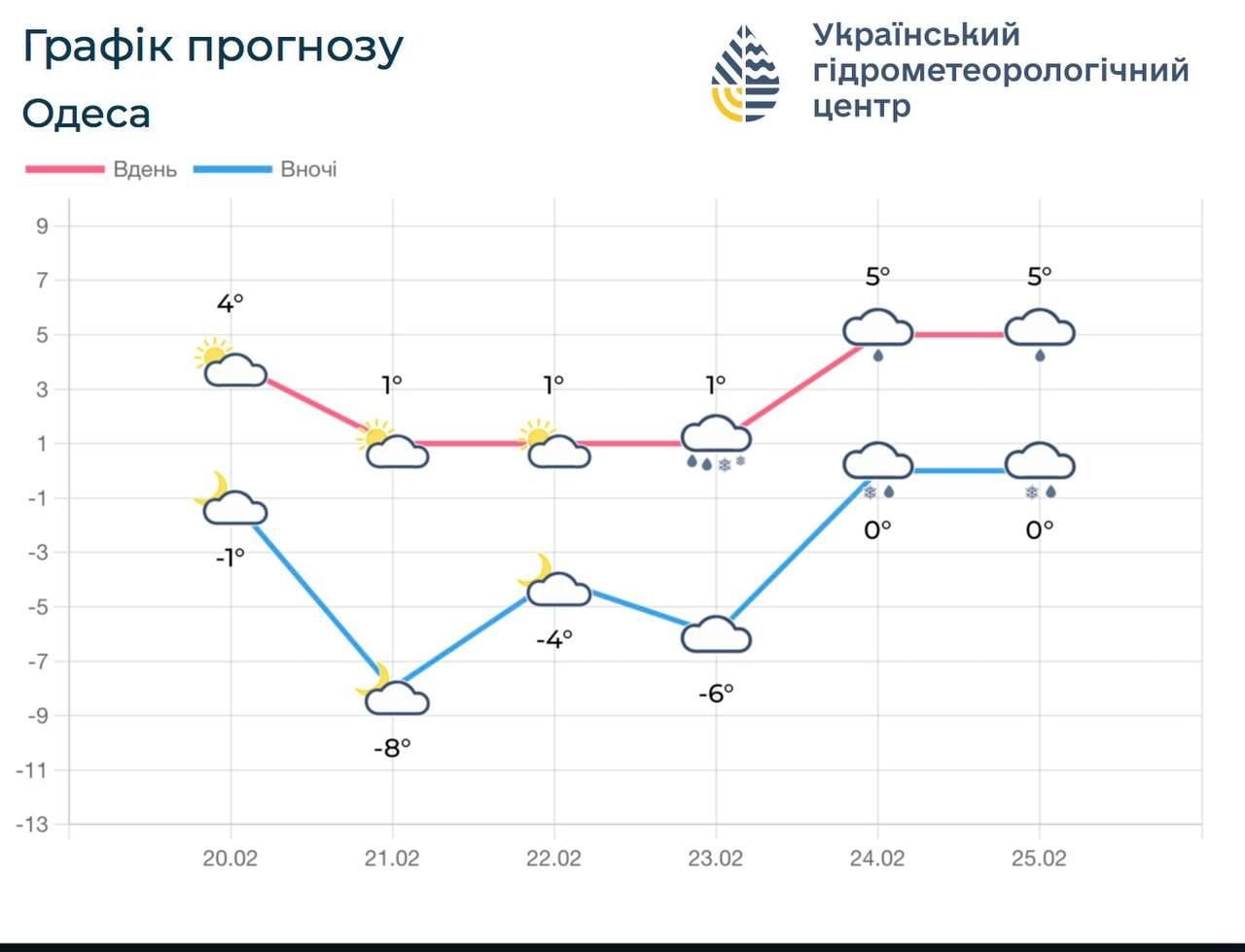 Водночас метеоролог Ігор Кібальчич повідомляє, що 21 лютого в Україні пануватиме сильний мороз без істотних опадів, лише на півдні Одещини можливий мокрий сніг. Найхолодніша ніч очікується на півночі та заході — до -22 градусів, у центрі та на сході стовпчики термометрів покажуть від -8 до -17 градусів морозу.