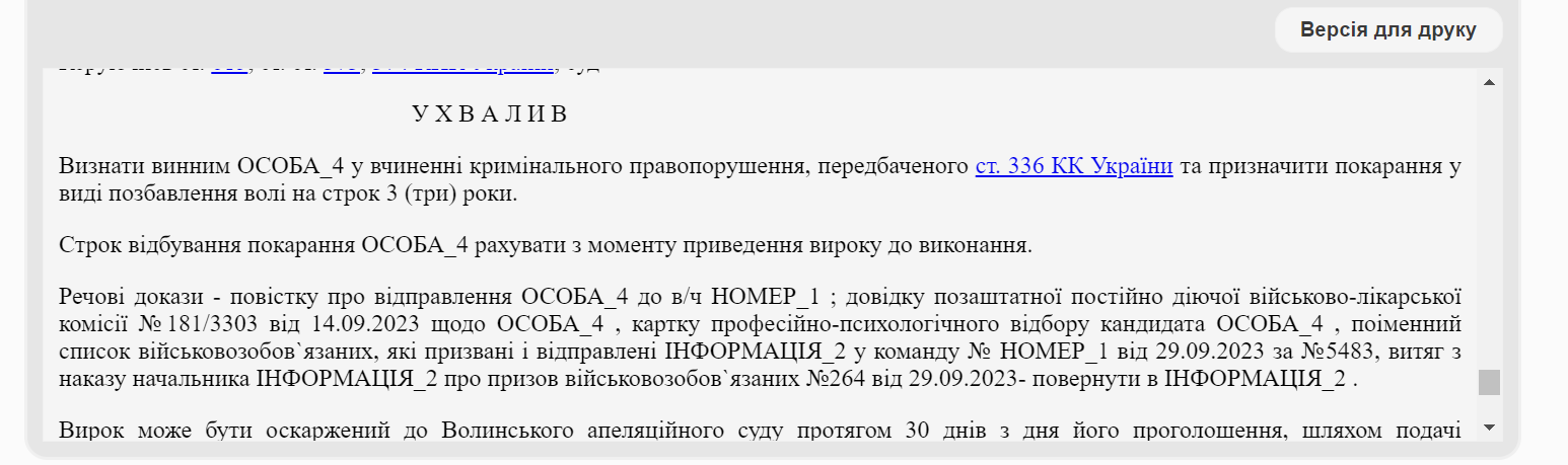 За даними суду, чоловік у вересні 2023 року пройшов ВЛК, яка визнала його придатним до служби в армії. Житель Волині отримав бойову повістку та мав прибути до ТЦК для відправлення на військову службу, проте ухилився.