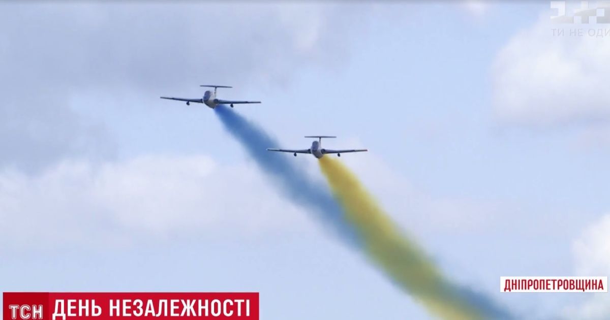 У небі над Дніпропетровщиною на висоті пташиного польоту створили синьо-жовтий прапор. Синхронне малювання по хмарах майстерно виконали пілоти бойових літаків за допомогою кольорового диму. Іще один 12-метровий прапор на землю спустив парашутист під побажання мирного неба над усією Україною. В обласному центрі гостей свята розважали 2-метровими фігурами Мавки, козака Пацюка та інших, які створив скульптор із Луганська Анатолій Квітка. Він зізнається, що в такий спосіб утілив мрії про мир та повернення додому. "На одному диханні все зроблено", - сказав майстер.