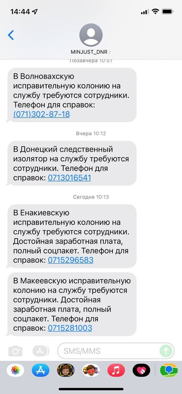 В Маріуполі абоненти окупаційного мобільного оператора "Фенікс" останніми днями отримають розсилку від так завного Мінюсту ДНР. У повідомленнях окупанти вербують людей влаштовуватися на роботу до катівень.