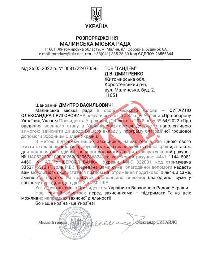"Нещодавно приватним підприємцям Малинської громади надійшли листи з проханням перерахувати на особистий рахунок в одному з банків кошти ніби то на підтримку ЗСУ. При чому цей лист надійшов на фейковому бланку від імені міського голови Олександра Ситайла", - йдеться у повідомленні.