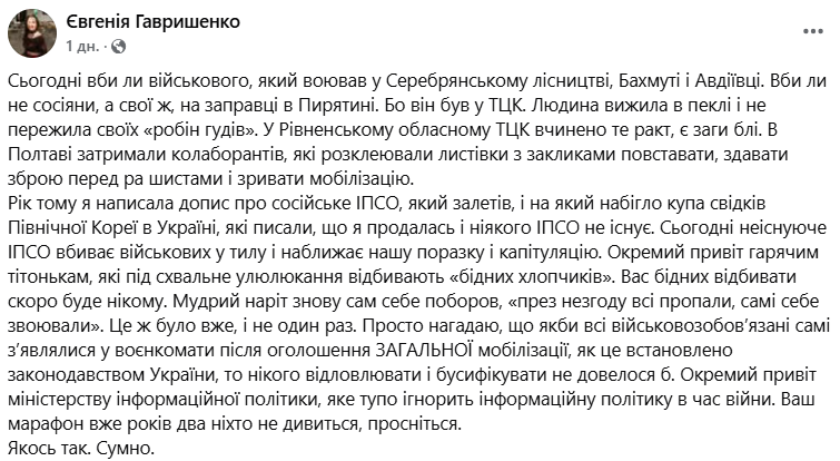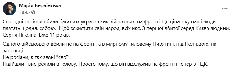 Ветеранка та волонтерка Марія Берлінська також повідомила, що загиблий воював на фронті, а потім був переведений на службу у ТЦК.