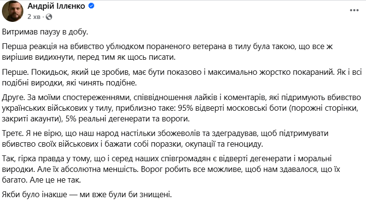 Екснардеп і військовий бригади Нацгвардії "Рубіж" Андрій Іллєнко поділився власними спостереженнями. На його думку, співвідношення лайків і коментарів, які підримують вбивство українських військових у тилу, приблизно таке: 95% відверті московські боти (порожні сторінки, закриті акаунти), 5% – "реальні дегенерати та вороги".