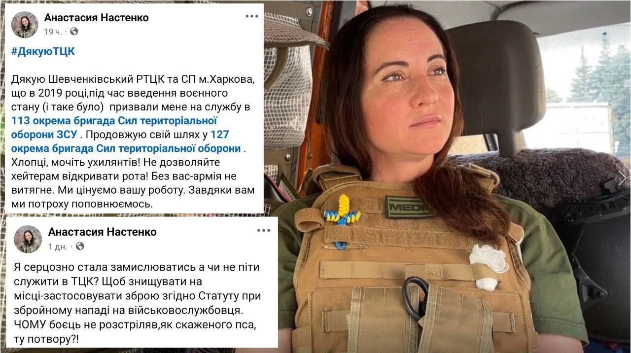 Парамедикиня Анастасія Настенко пішла ще далі і зізналася, що навіть задумалася про службу в ТЦК, щоб “знищувати на місці” тих, хто нападає на військових.