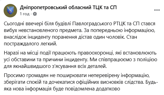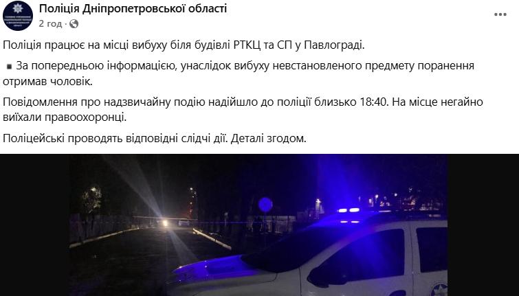 Схожий інцидент стався вже сьогодні ввечері біля будівлі ТЦК у Павлограді на Дніпропетровщині. За словами правоохоронців, "унаслідок вибуху невстановленого предмета зазнав поранення чоловік". Поліцейські проводять слідчі дії.