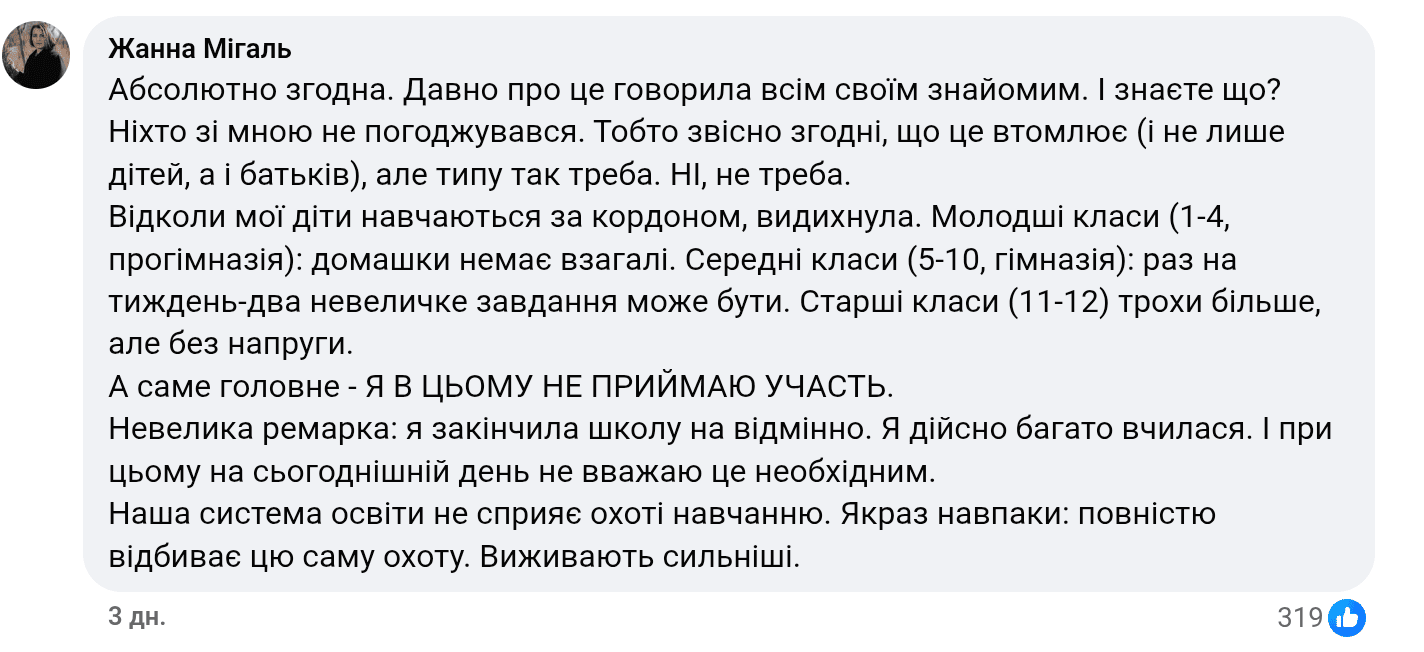 На думку автора допису, домашні завдання — це шлях в нікуди. Дитина, яка вже «відпахала зміну в школі», змушена приходити додому і знову сідати за роботу. Це призводить до того, що замість родинного спілкування та відпочинку у квартирах лунають крики та сварки через невивчені уроки.