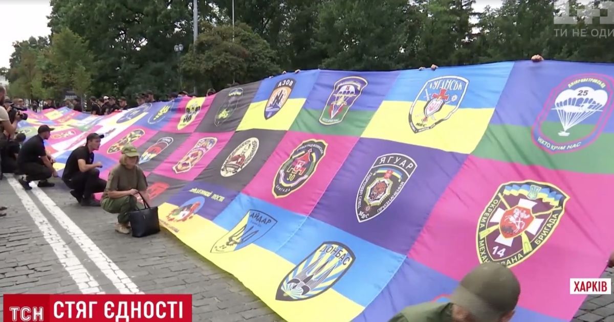 50-метровий прапор єдності розгорнули в Харкові до Дня шани воїнів та волонтерів АТО. Він пошитий із прапорів різних батальйонів, бригад, частин Збройних сил України та волонтерських організацій, ідеться в сюжеті ТСН.19:30.
