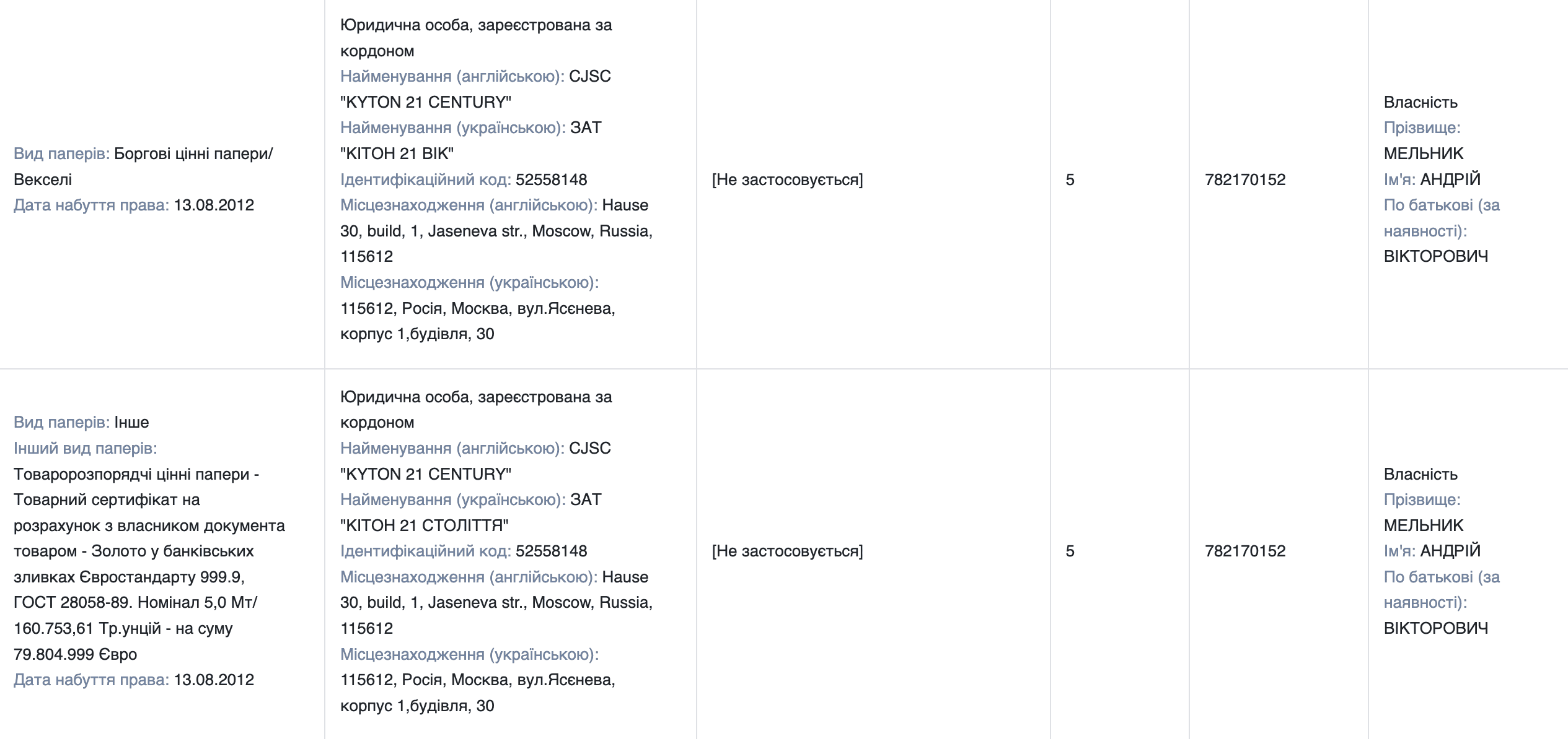 За даними декларації, золото зберігається у ЗАТ “КІТОН 21 СТОЛІТТЯ”, яке розташоване в Москві, по вулиці Ясєнева, корпус 1, будівля 30.
