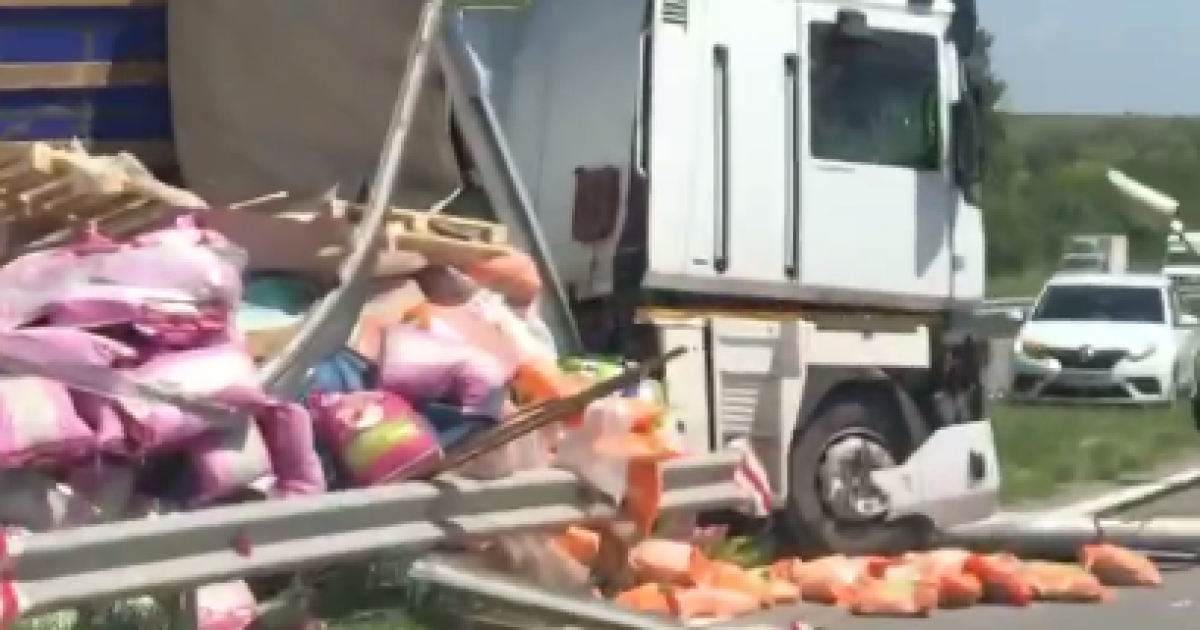 Під Дніпром на Криворізькій трасі сталася ДТП із фурою. Вона вилетіла на зустрічну смугу та "розклалася", а весь вантаж висипався.