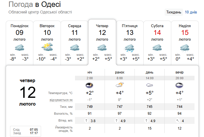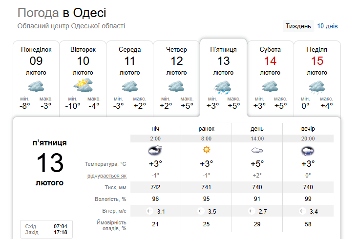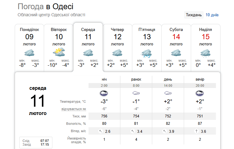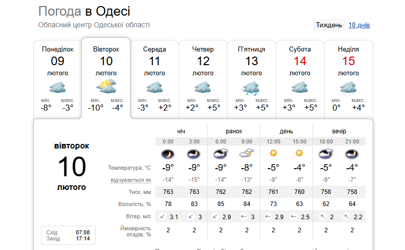 Водночас Sinoptik прогнозує, що в Одесі вночі 10 лютого очікується від -9 до -11 градусів морозу, вдень — близько -2…-4 градусів нижче нуля. Вітер південно-східний зі швидкістю 9–14 м/с.