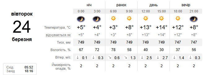 У вівторок, 24 березня, очікується мінлива хмарність. Нічна температура коливатиметься від 2 градусів морозу до 3 градусів тепла, а на півдні — до +6 градусів. Вдень повітря прогріється до комфортних +16 градусів. На Закарпатті та Одещині очікується близько 19 градусів вище нуля. У Карпатах буде прохолодніше: вночі до 5 градусів морозу, вдень — близько 9 градусів тепла.