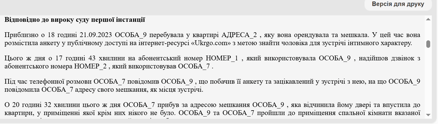 Історія розпочалася у вересні 2023 року. Одеситка розмістила анкету на сайті інтим-послуг, на яку відгукнувся 36-річний чоловік. Він прийшов до неї додому, між ними відбувся статевий акт. Проте відразу після інтиму «кавалер» змінив тактику: він схопив жінку за шию та почав вимагати гроші та цінні речі.