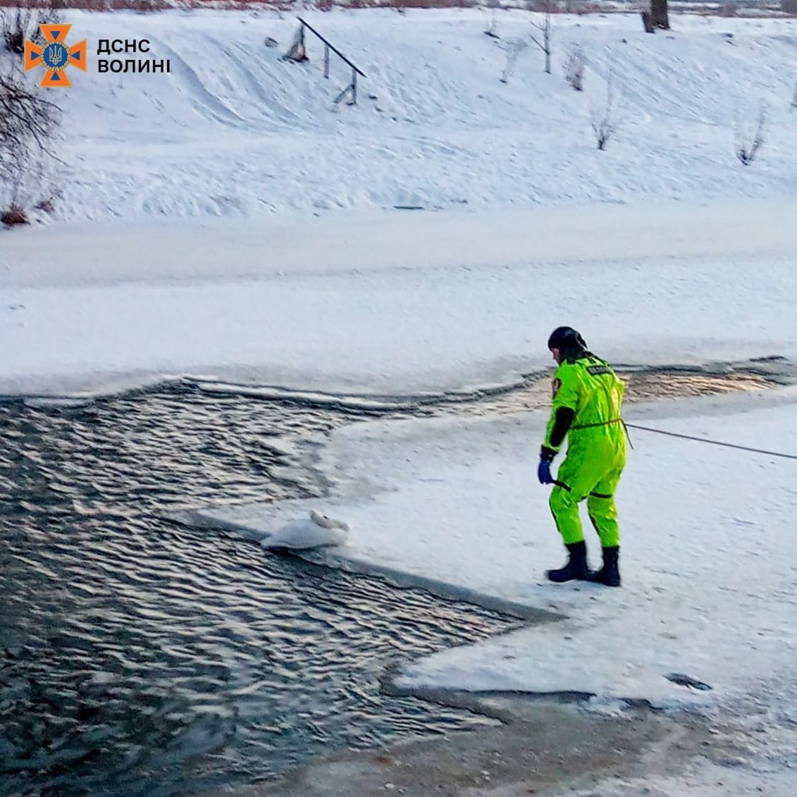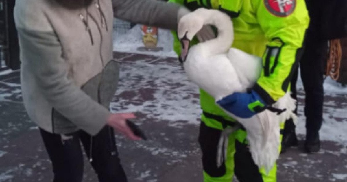 Рятувальники обережно забрали лебедя, який сидів нерухомим на краю крижаної ополонки. Його передали фахівцям.