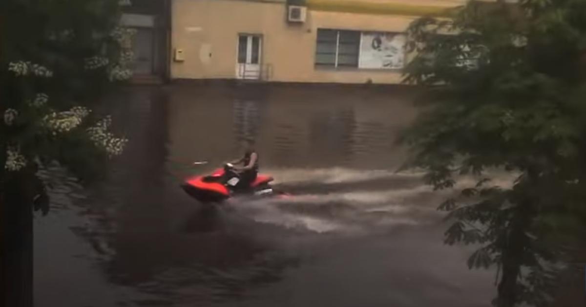 Потужна злива у Житомирі: містяни плавають вулицями на надувному матраці та водяному мотоциклі (фото, відео)