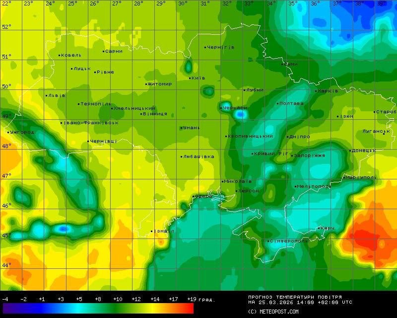 У середу, 25 березня, у більшості областей збережеться комфортна температура — вдень стовпчики термометрів піднімуться до +12…+16°C. Проте синоптична мапа фіксує цікаву аномалію: через Полтавщину, Харківщину та Кропивницький аж до Криму простягнеться «смуга холоду», де температура не перевищить +7…+11°C.