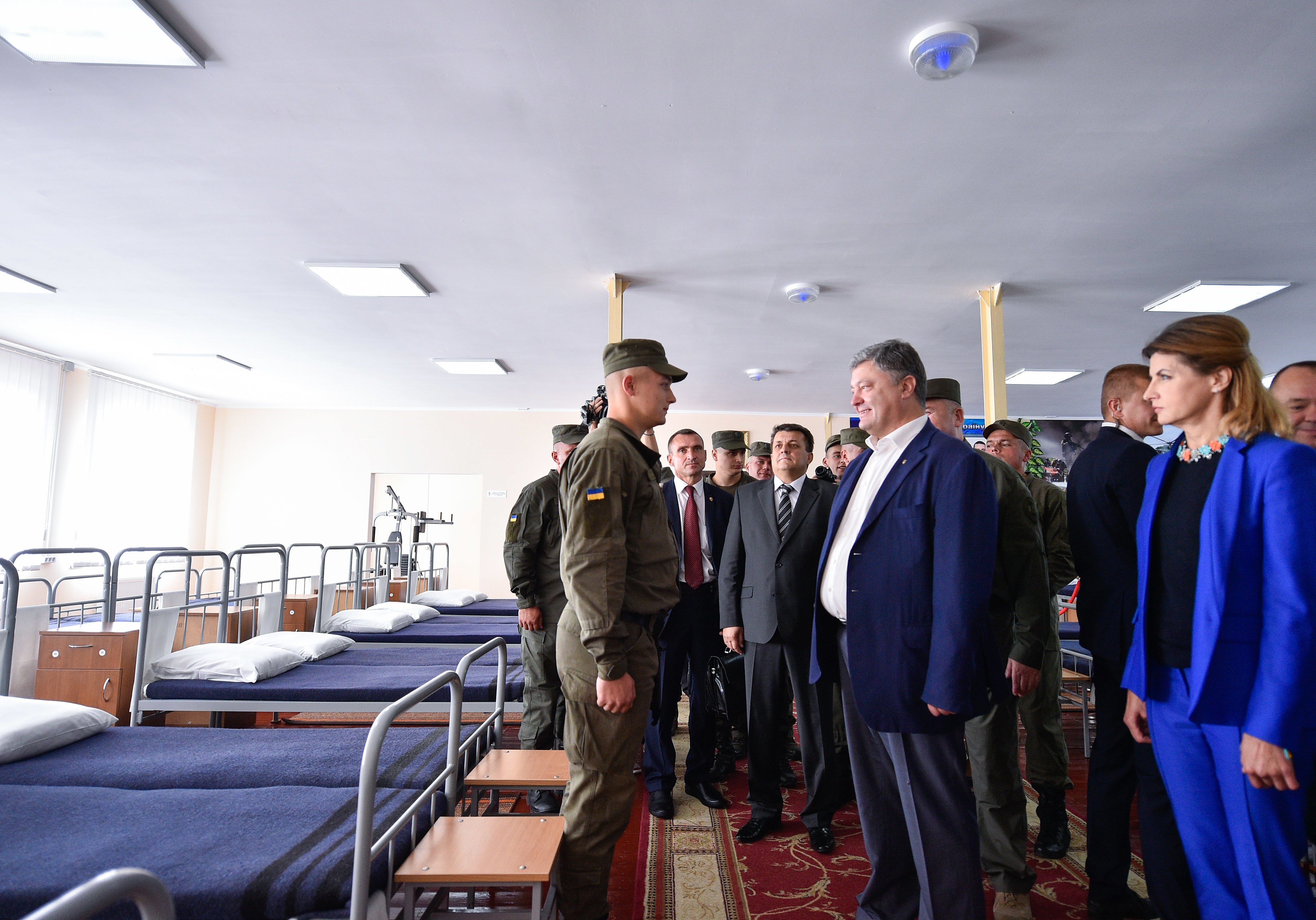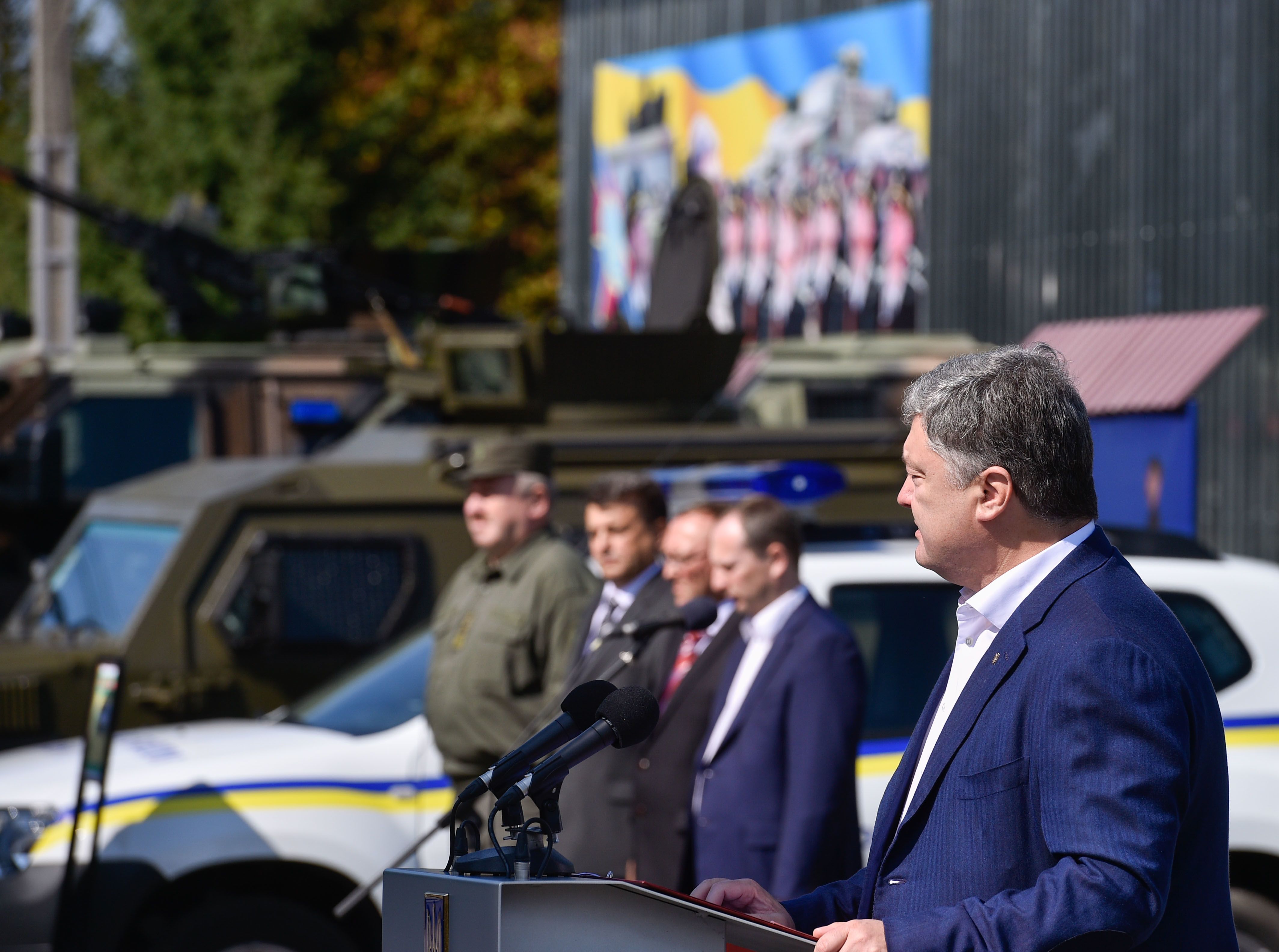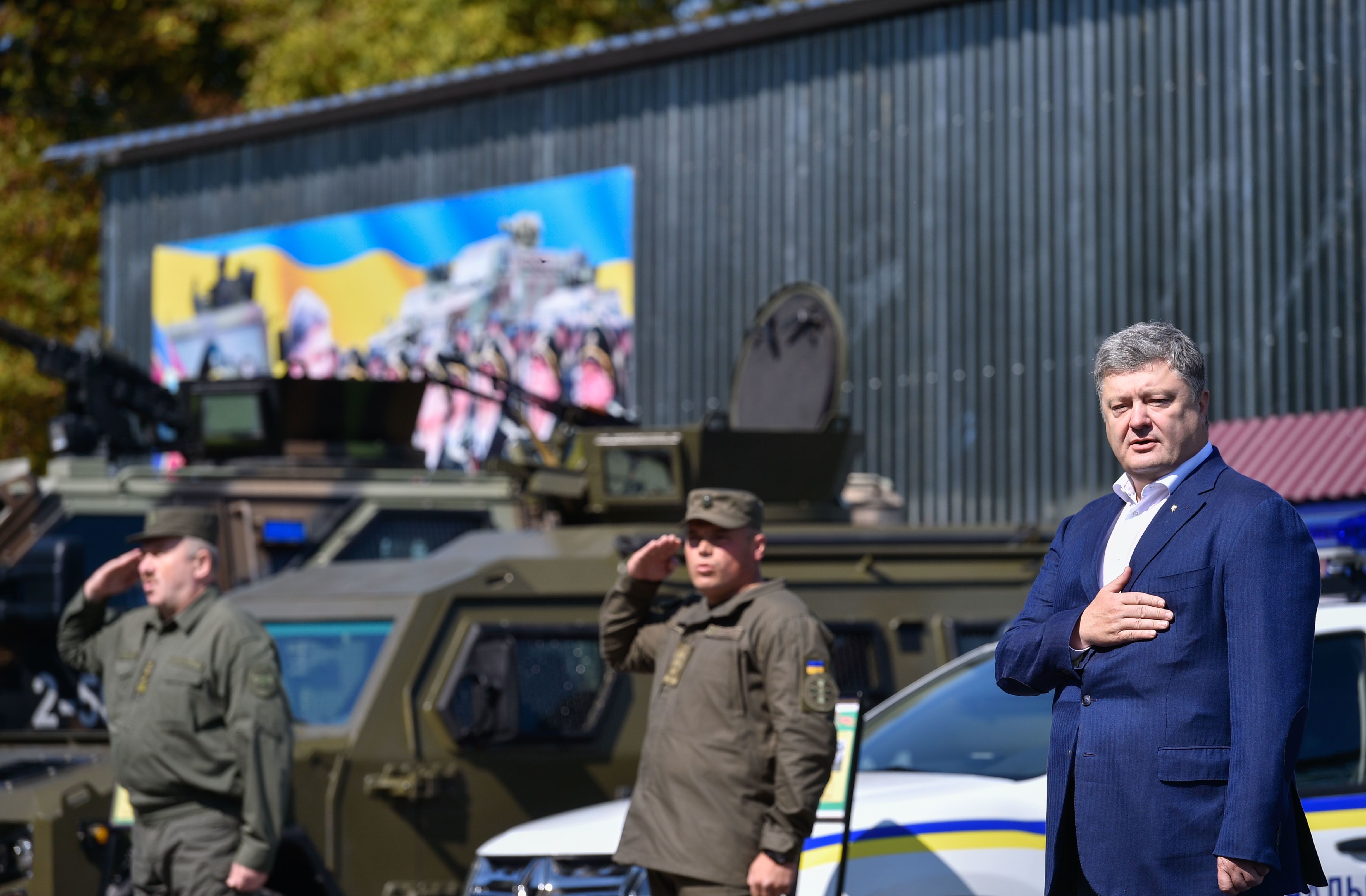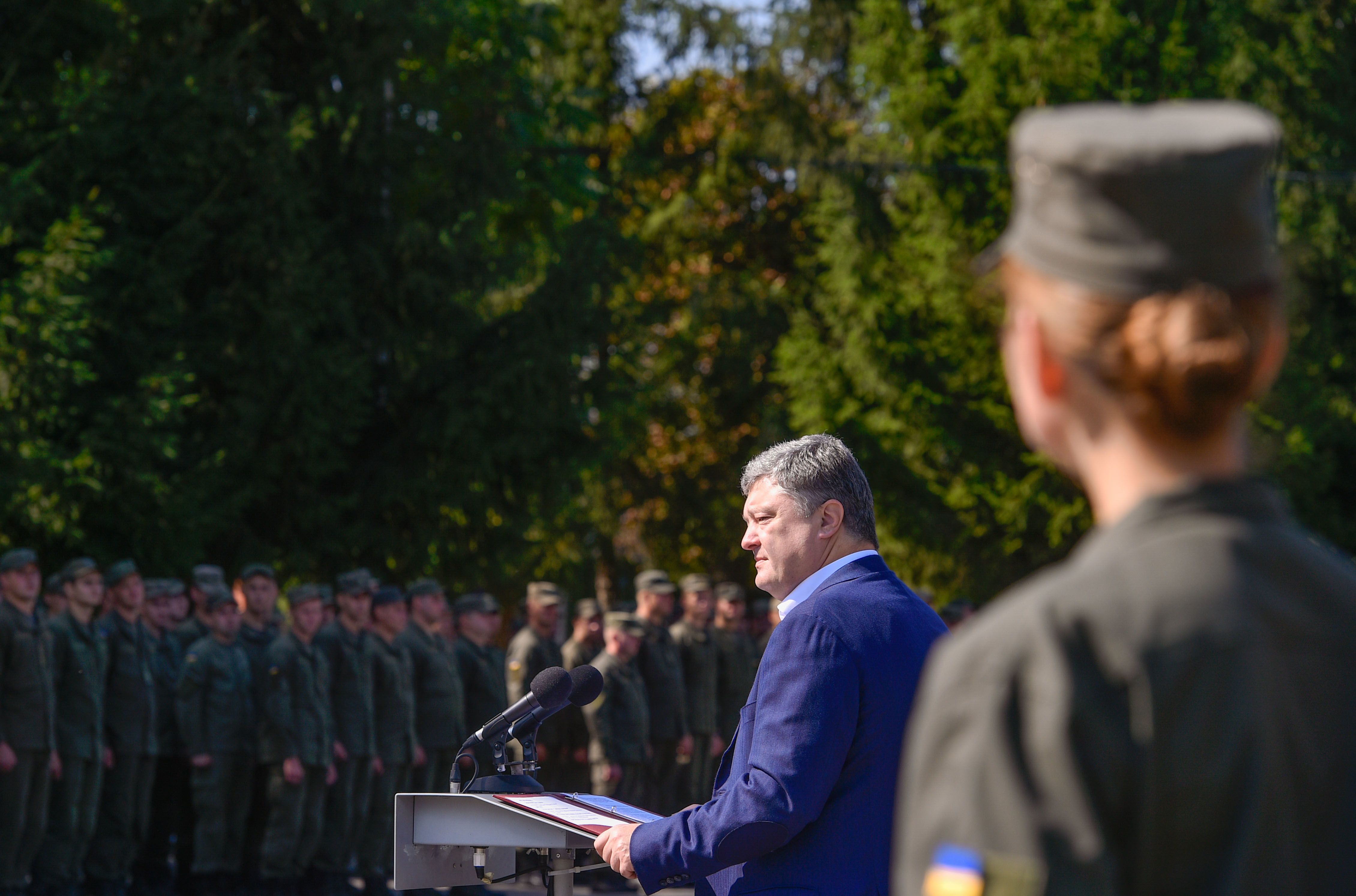Президент Петро Порошенко під час робочої поїздки до Вінницької області в суботу, 9 вересня, відвідав одну з військових частин Національної гвардії та відзначив державними нагородами військових.