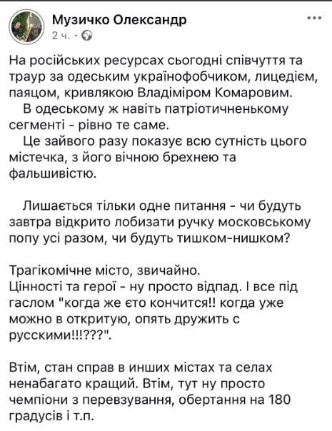Професор Олександр Музичко, який працює викладачем історії в Одеському національному університеті імені І. І. Мечникова, спричинив скандал дописом у соцмережі про смерть актора «Маски-шоу» Володимира Комарова. З цього приводу у виші розпочали службове розслідування.