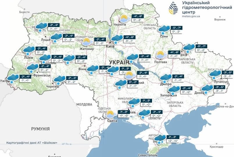 У Карпатах помірний сніг; температура вночі 6-11° морозу, вдень 3-8° морозу.