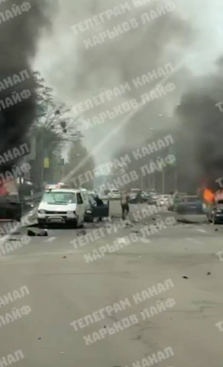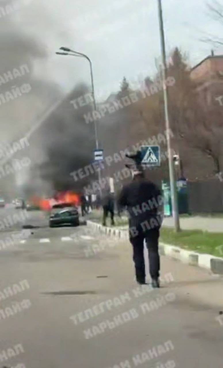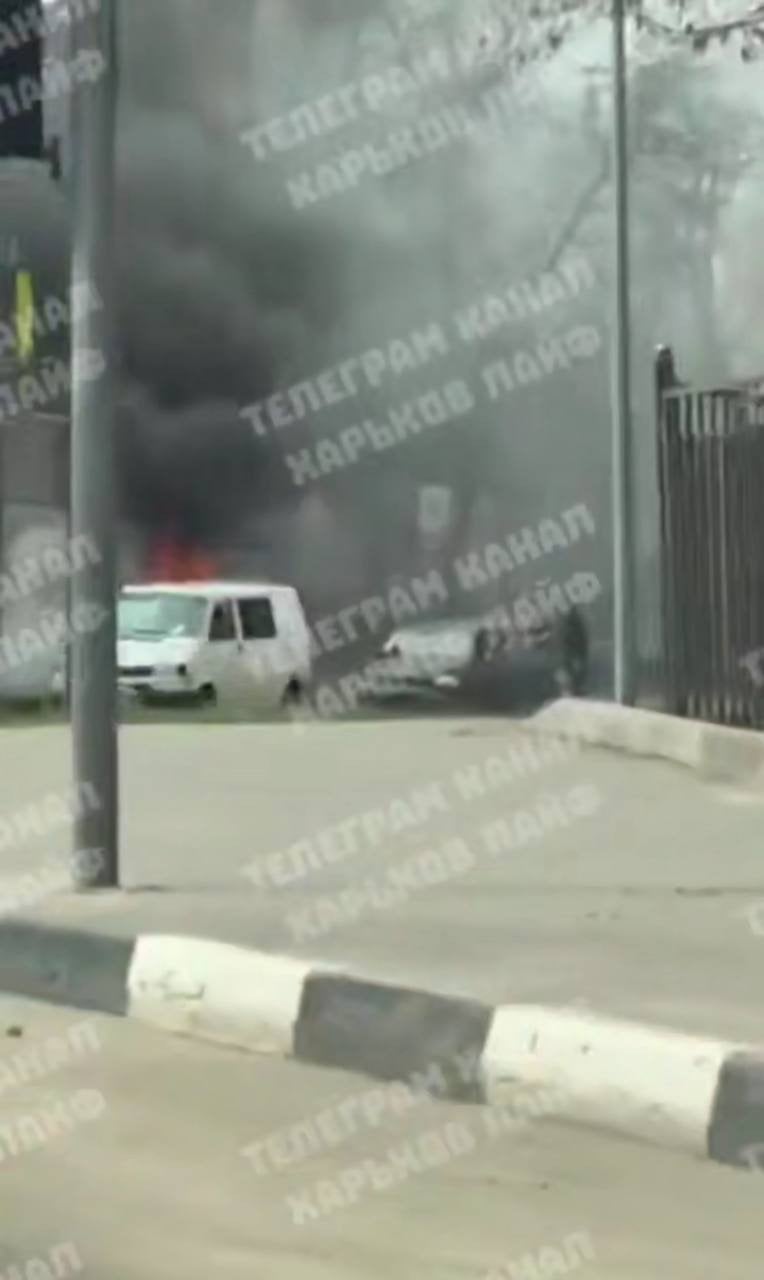 Місцеві телеграм-канали публікують фото Харкова після атаки. На кадрах видно масштабне задимлення та охоплені вогнем машини.