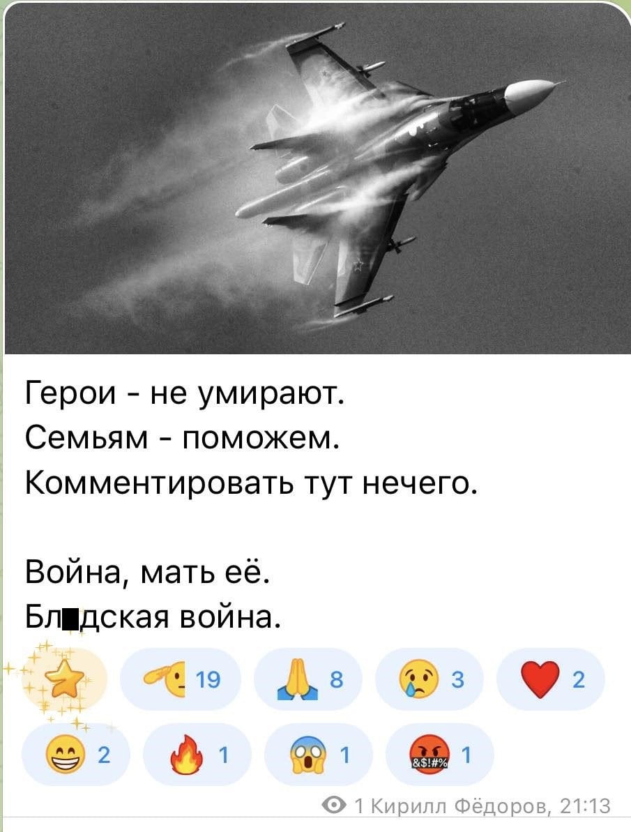 Зокрема, російський «воєнкор», капітан збройних сил РФ Ілля Туманов із Воронежа, який веде свій канал Fighterbomber, опублікував траурне повідомлення.