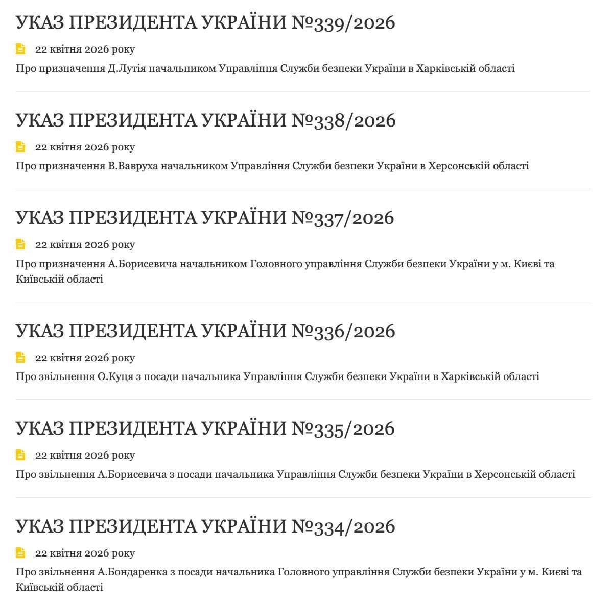 Зокрема, звільнено начальника Головного управління СБУ у місті Києві та Київській області Артема Бондаренка. На його місце призначено Артема Борисевича.