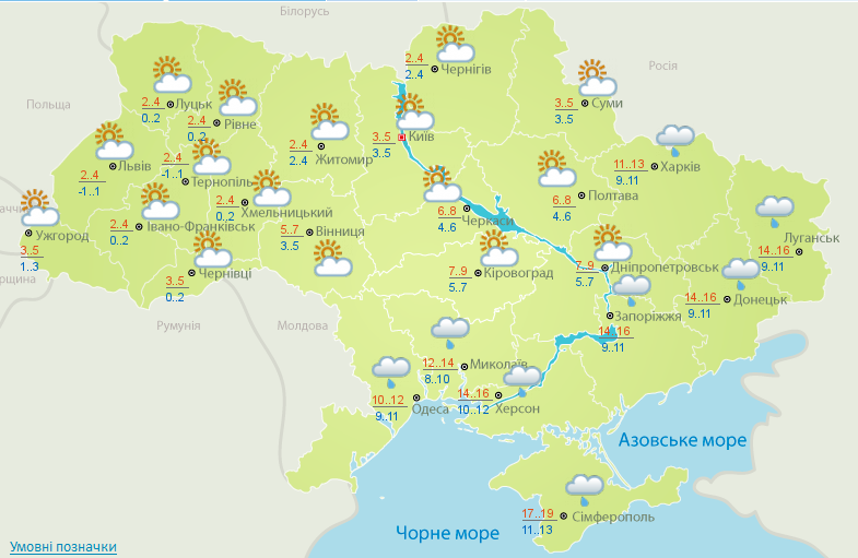 У західних та північних областях температура вдень коливатиметься від 0 до +5 градусів. У центральних областях буде трохи тепліше - +2…+7 градусів тепла. На решті території збережеться досить тепла погода: температура повітря прогріється до +12…+17 градусів, а в Криму - до +20.