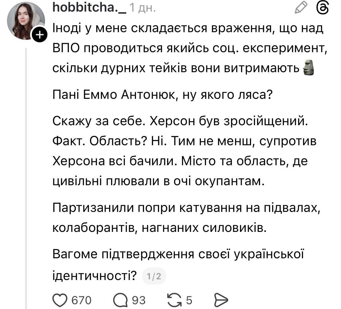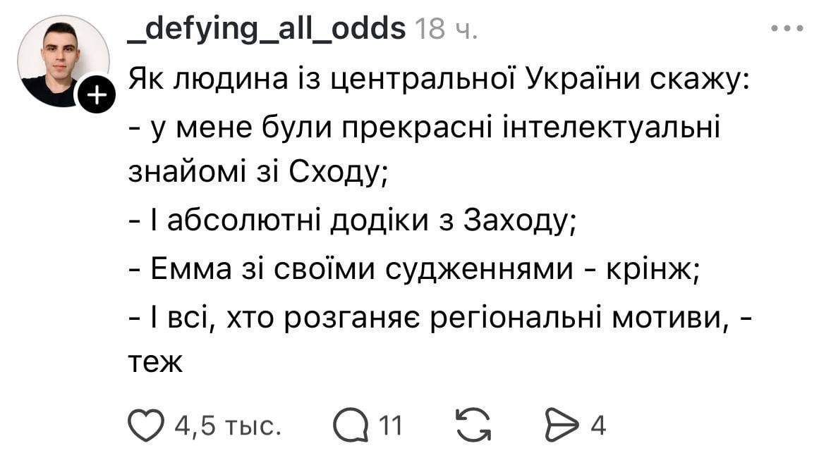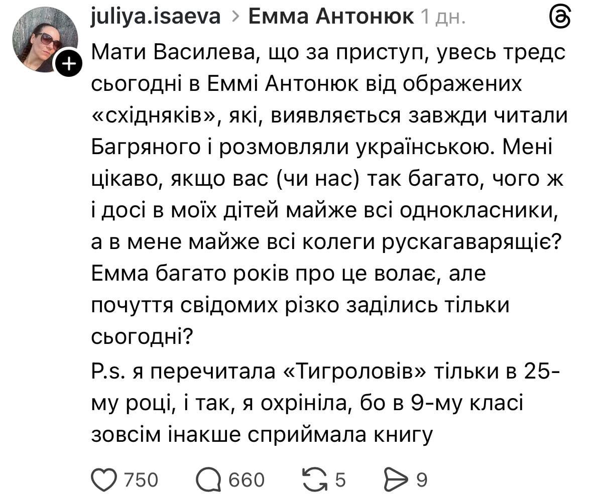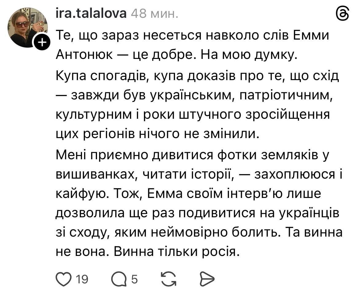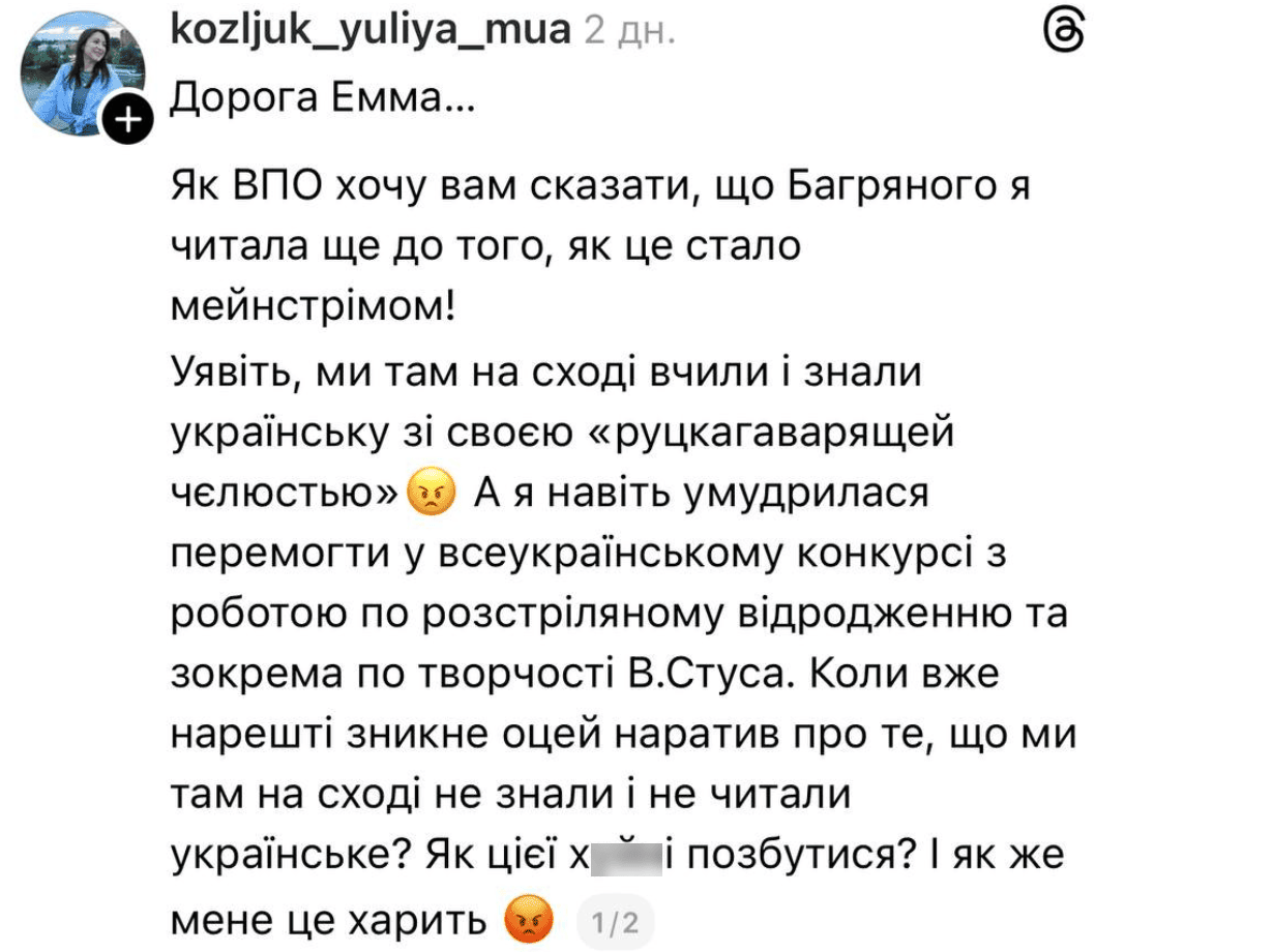 Після оприлюднення інтерв’ю мережа Threads вибухнула обуренням. Мешканці сходу та півдня України почали масово спростовувати тезу про «необізнаність» регіону. Користувачі нагадували, що вивчали українську літературу, твори Василя Стуса та Миколи Хвильового задовго до того, як це стало трендом.