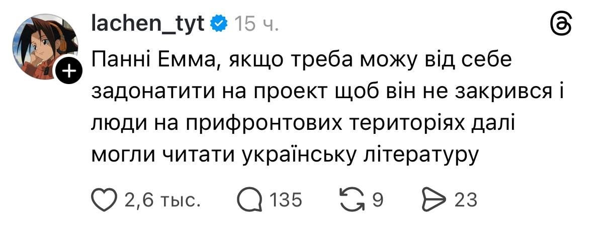 Блогерка підкреслила, що й надалі самостійно відправлятиме книжки до сільських бібліотек, адже вважає цю роботу стратегічно важливою для подолання наслідків столітнього зросійщення.