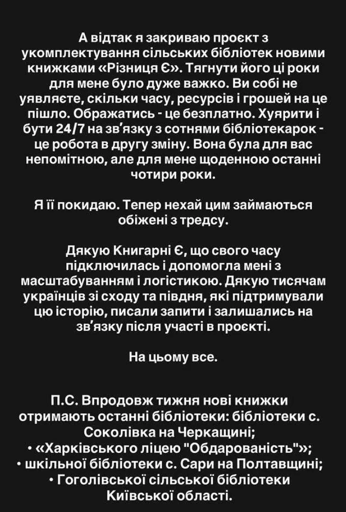 Далі вона оголосила про нібито завершення свого проєкту «Різниця Є», який протягом кількох років займався постачанням нових україномовних книжок до сільських та прифронтових регіонів. Антонюк пояснила, що самостійно координувала цю роботу, проте це залишалося непомітним для загалу.