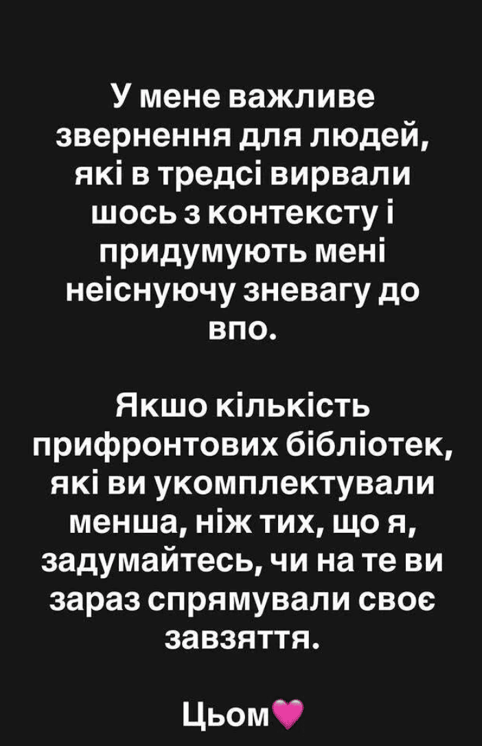 «Я точно бачу, що переважна більшість людей, які обурились цим висловам, не дивились інтервʼю. А відтак і не зауважили фрази „і якби я не чула ці історії від бібліотекарок“. Тобто, виявляється, я не говорила про ваш особистий досвід (тяжкий, трагічний, який мені особисто не доводилось переживати). А всього-на-всього переказувала історії, якими хвалились бібліотекарки в приватних розмовах. І так, ці історії не були особисто про вас», — зазначила авторка допису.