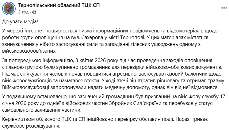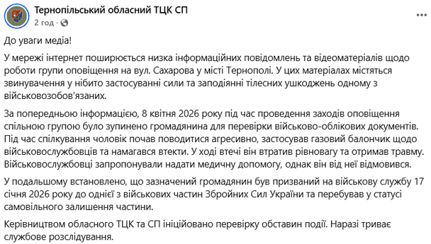 Тернопільський обласний ТЦК та СП запевняє, що їхні військові абсолютно невинуваті, а чоловік нібито просто впав і зламав ногу.